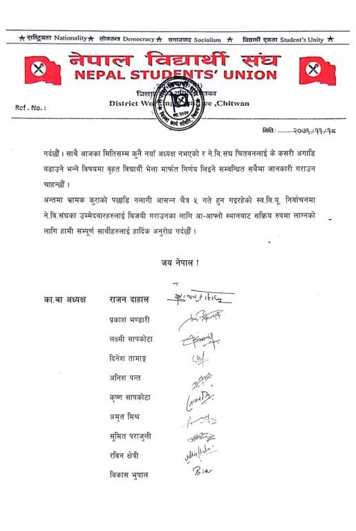 आजका मितिसम्म नेविसंघ चितवनको नयाँ अध्यक्ष कोहि नभएको र नेविसंघलाई अगाडि बढाउने विषयमा वृहत विद्यार्थी भेला मार्फत निर्णय गरिने उनीहरुले बताएका छन् । साथै भ्रामक कुराको पछाडि नलागी चैत ५ गते हुन लागेको स्ववियु निर्वाचनमा आफ्नो उमेदवारलाई विजयी गराउन सक्रिय रुपले लाग्न पनि आग्रह गरिएको छ ।