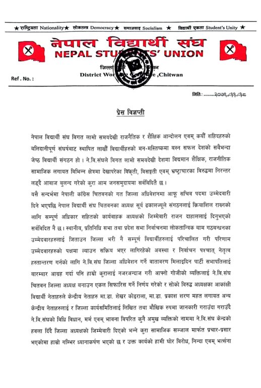 ‘नेविसंघको विधि, विधान, मर्म एवम् भावना विपरित कुनै अमुक व्यक्तिको नाममा नेविसंघ केन्द्रको हवला दिँदै जिल्ला अध्यक्षको जिम्मेवारी दिएको भन्ने कुरा सामाजिक सञ्जाल मार्फत प्रचार–प्रसार भएकोमा हाम्रो गम्भिर ध्यानाकर्षण छ र उक्त कार्यको हामी घोर विरोध, निन्दा एवम् भत्र्सना गर्दछौँ’, जारी विज्ञप्तिमा भनिएको छ ।