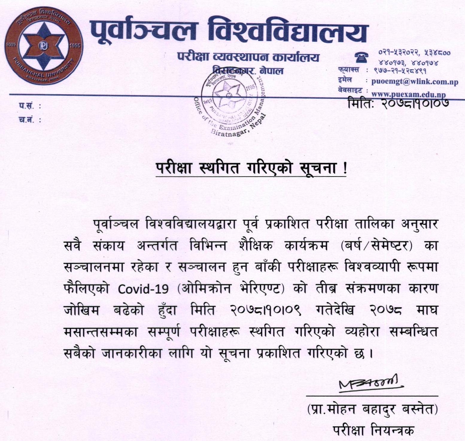 ओमिक्रोन भेरियन्टको तीब्र संक्रमणका कारण जोखिम बढेकाले माघ ९ देखि माघ मसान्तसम्मका सम्पूर्ण परीक्षाहरु स्थगित गरिएको परीक्षा नियन्त्रक प्रा. मोहनबहादुर बस्नेतले जनाएका छन् ।